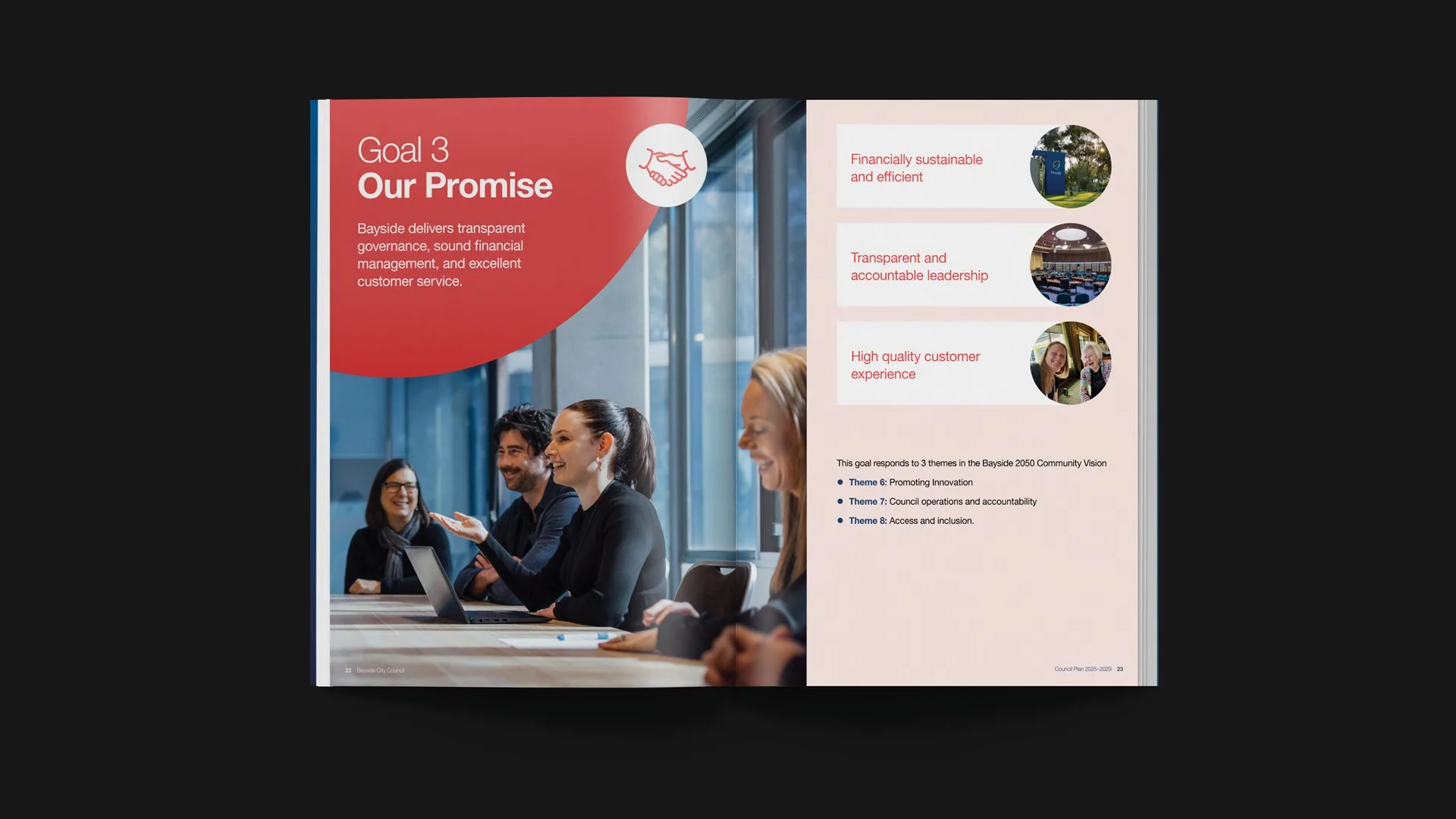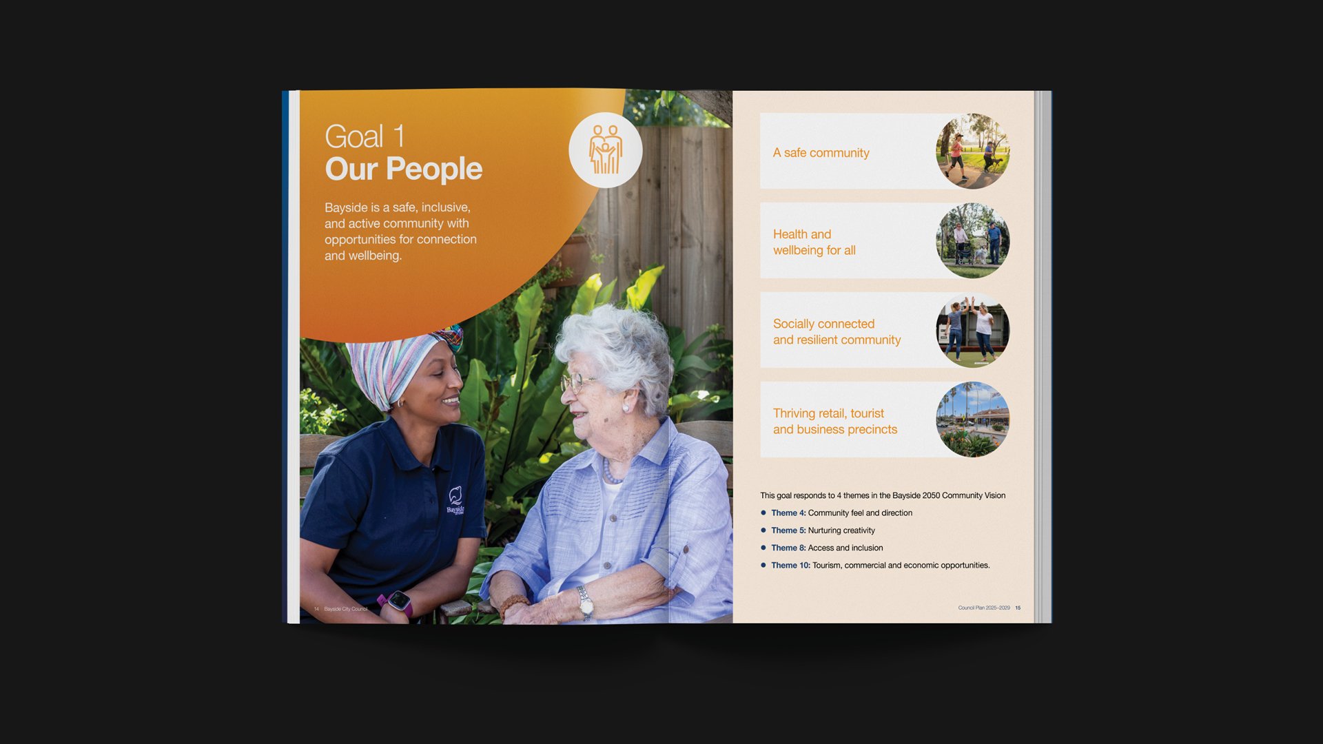 Bayside City Council needed a complete visual overhaul of its Council Plan to reflect the values and goals of its refreshed 2050 Community Vision, while meeting a broad set of accessibility, legislative, and audience requirements.