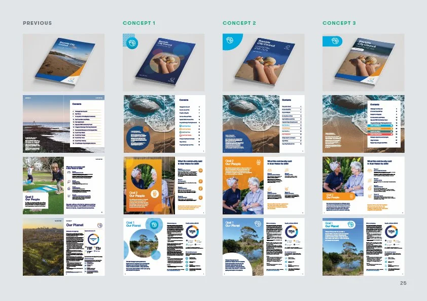 Three unique design directions were presented, exploring different ways to visualise Bayside’s natural landscape, demographic data, and strategic commitments while remaining brand-aligned and people-focused.